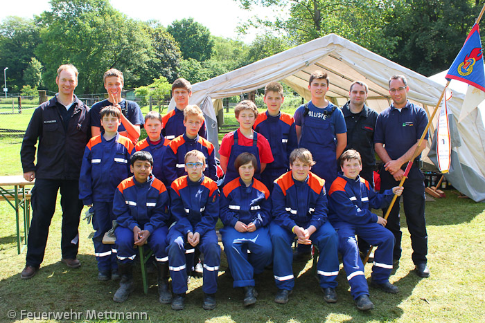 Auch die Jugendfeuerwehr Mettmann nahm in diesem Jahr mit insgesamt 13 Jugendlichen an der Veranstaltung teil. Los ging es am späten Freitagnachmittag auf der Mettmanner Feuerwache. Als nach mehrmaliger Kontrolle durch die Ausbilder auch endlich alle Gepäckstücke auf die Fahrzeuge verladen waren, konnte die Fahrt zum Zeltplatz nach Hilden beginnen. Nach Abladen des Gepäcks folgte die erste Herausforderung – der Aufbau des Zeltes. Diese wurde mit Bravur gemeistert und als Belohnung gab es im Anschluss an die Begrüßung durch die Feuerwehr Hilden ein schmackhaftes Abendessen. Bedauerlicherweise war bereits kurz nach dem Essen der Verlust des Mettmanner Jugendfeuerwehrwimpels zu beklagen, welcher ohne Gegenwehr aus unserem Zelt entnommen worden war. Auslöseverhandlungen mit der Jugendfeuerwehr Haan blieben vorerst ohne Erfolg. Die dennoch gute Stimmung am Abend, mit Gitarrenmusik und Lagerfeuer, wurde nur leicht durch den zeitweisen Niederschlag gedämpft. Schnelles Handeln war dann noch gefragt, als im Zelt plötzlich die Meldung: „Also irgendwie tropft’s hier rein!“ zu vernehmen war. Nachdem die undichte Stelle lokalisiert und mit der Allzweckwaffe Klebeband geflickt worden war, konnte auch der kleine See, welcher sich in der Zwischenzeit schon auf dem Zeltboden angestaut hatte, wieder trockengelegt werden.