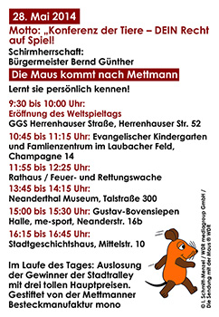 Für den Weltspieltag, am kommenden Mittwoch, den 28. Mai 2014, hat Nicola Hengst-Gohlke, die Maus nach Mettmann eingeladen. An insgesamt sechs Orten in der Stadt können Groß & Klein den tierischen Gast persönlich treffen.