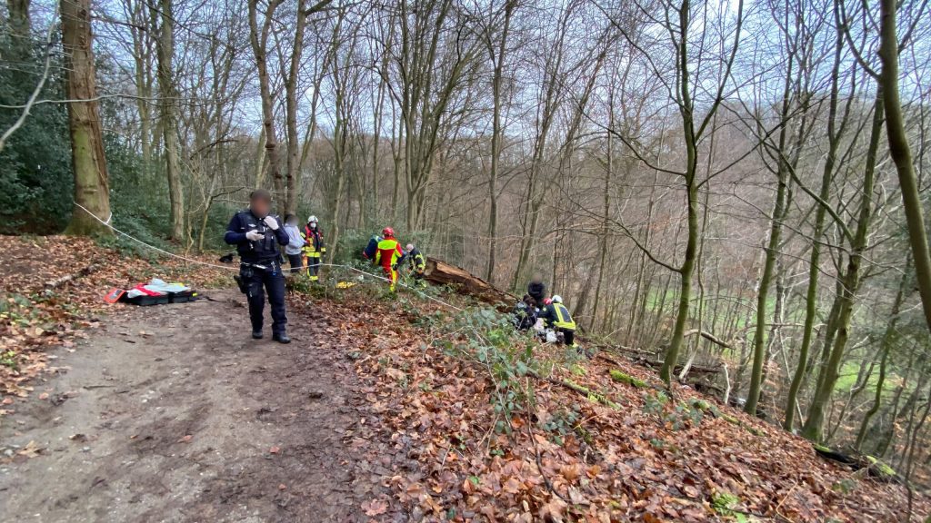 Gestürzte Person wird durch Rettungsdienst und Feuerwehr der Stadt Mettmann aus dem Neanderthal gerettet. Vorbildliches Verhalten der Ersthelfer sorgt für schnelle Rettung.