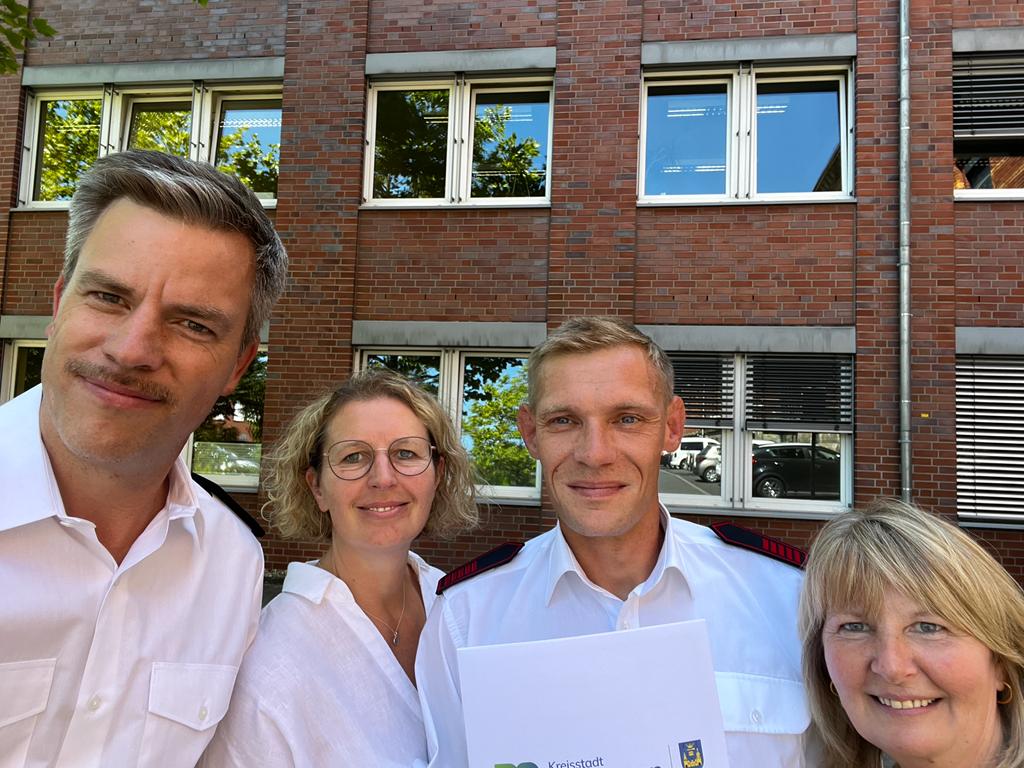 Bürgermeisterin Sandra Pietschmann überreichte Stefan Schacht die Beförderungsurkunde zum Hauptbrandmeister und gratulierte ebenso, wie Arne Vieweg, Abteilungsleiter Technik des Amtes für Feuerschutz- und Rettungswesen, zur Beförderung.