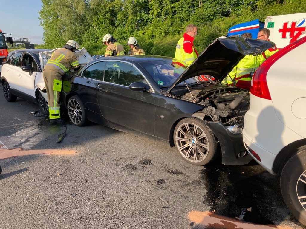 Vor Ort bestätigte sich das Meldebild. Die verletzten Personen wurden alle durch die anwesenden Notärzte gesichtet, nach der Schwere ihrer Verletzungen kategorisiert und auf die umliegenden Krankenhäuser verteilt. Insgesamt mussten drei Patienten durch Rettungswagen transportiert werden. Durch die Feuerwehr wurde der Brandschutz sichergestellt, auslaufende Betriebsstoffe aufgenommen und die Einsatzstelle abgesichert. Nach Abschluss aller Maßnahmen wurde die Einsatzstelle an die Autobahnpolizei übergeben.