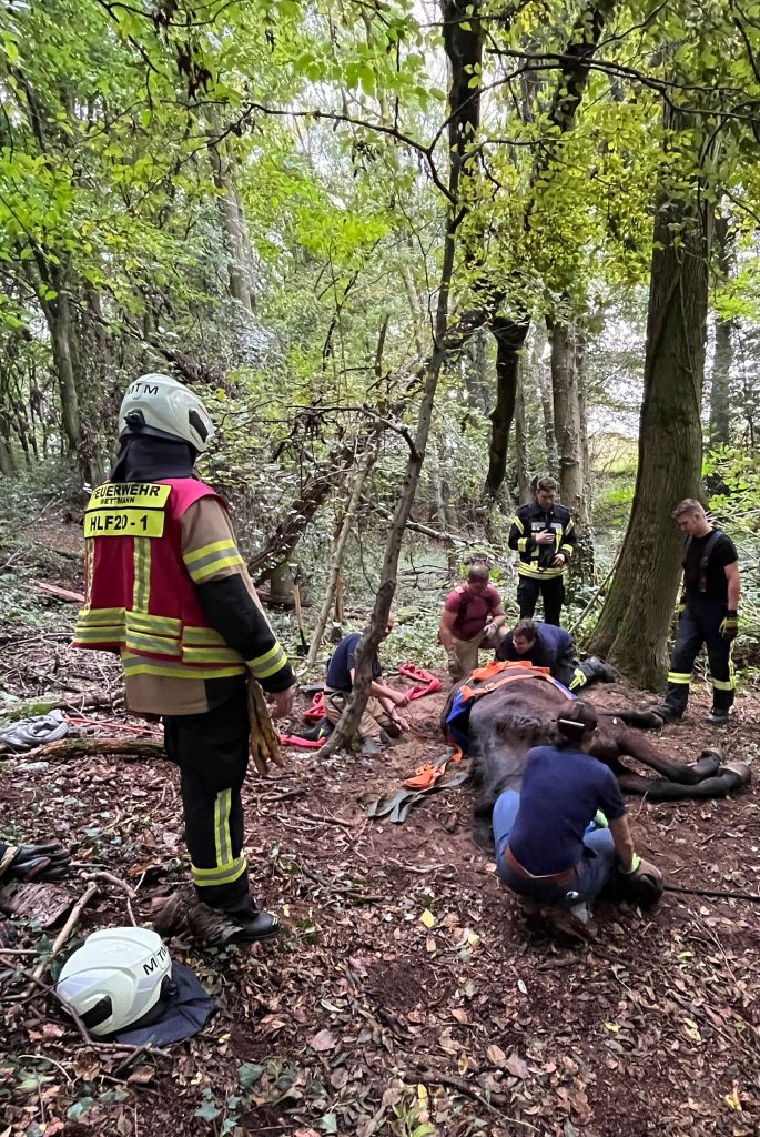 Die Feuerwehr Mettmann wurde am Freitag, den 13. Oktober 2023 gegen 15:04 Uhr mit dem Einsatzstichwort „Großtier in Not“ nach Mettmann-Metzkausen alarmiert. Laut Einsatzmeldung sollte dort ein Pferd, beim Reiten durch den Wald, in einem Erdloch eingebrochen sein und sich selbständig nicht mehr befreien können.